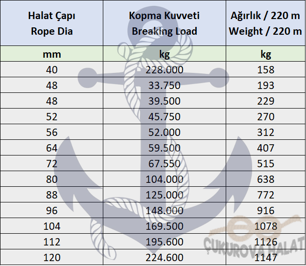 Yüksek çekiş gücüne sahip olan 8 kollu yüzen halat, gemi bağlama halatı olarak bilinen 8 Kollu Polipropilen Halatlardır. Llyod gurubu tarafından onaylanmış ve sertifikalı halatlardır. Su, deniz veya açık alanlarda sorunsuz bir kullanım sağlamaktadır. Bağlama, çekme, tutma amaçlı kullanılan 8 Kollu Polipropilen Halatlardır Roda 220 metredir. Örgülü yapısı gam yapmasını engeller ve renkleri yeşildir. Diğer bükümlü halatlara istinaden çok daha güçlüdür. Örülebilir halatlardandır kasa örgüsü 8 kollu olmasından dolayı, ¾ bükümlü halatlara istinaden daha farklıdır. Kasa alanında koruma kılıfı mevcut olup isteğe göre her kasa için kılıf uygulaması yapılır. Roda metrajları ve ağırlıkları standarttır. Gemi bbağlama halatı 8 kollu Polipropilen Halatlar her 8 mm bir artarak birbirini takip eden ölçülerle üretimi yapılır. Kopma kuvveti, halat çapı ve ağırlıkları teknik tabloda verilmiştir.